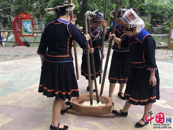 2022年9月4日,村民身著傳統壯族服飾打糍粑。攝影 中國網記者 蘇向東
