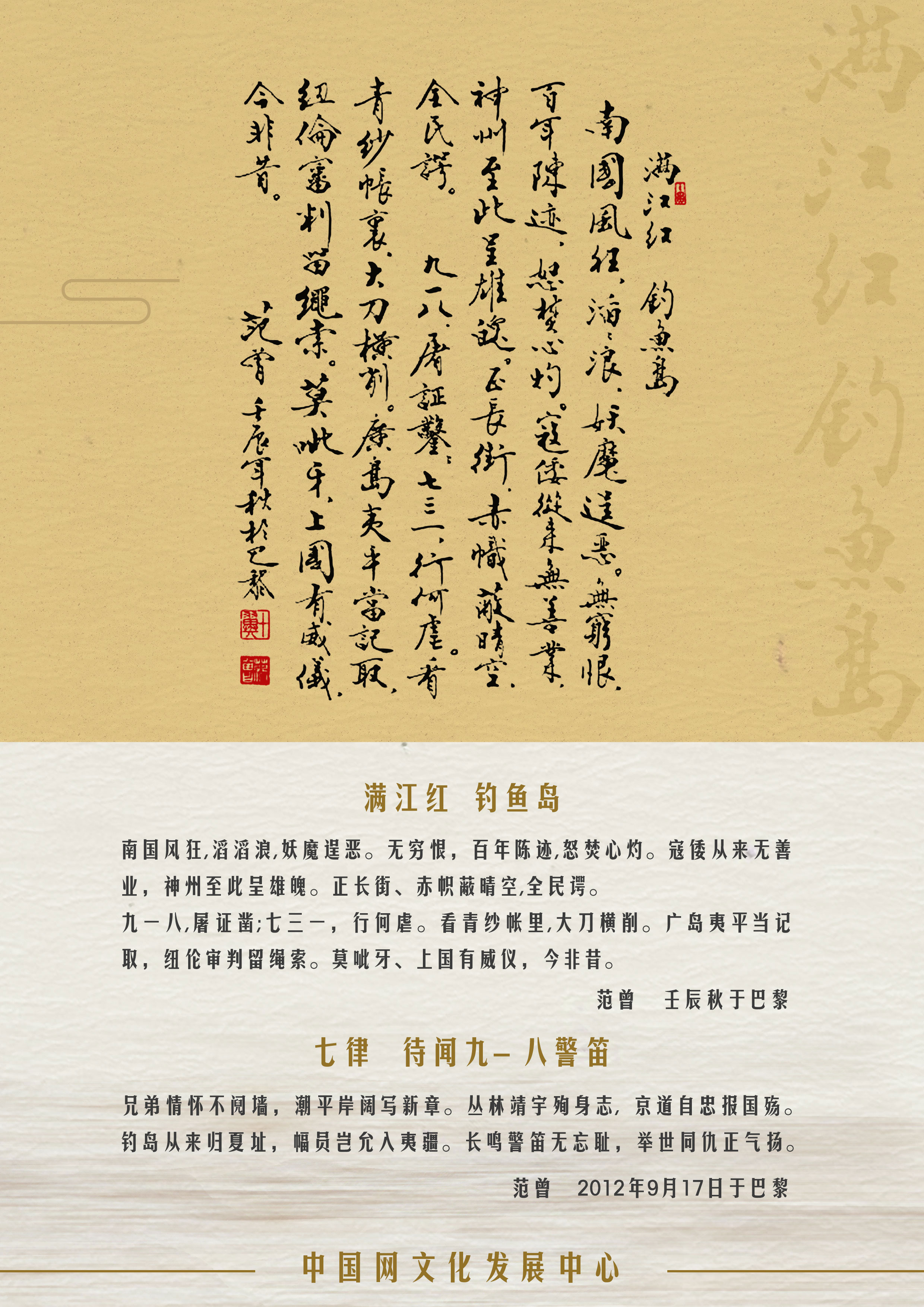 中國網9月18日訊 今年的9月18日是“九一八”事變爆發91周年紀念日。著名書畫大師范曾作七律《待聞九一八警笛》紀念“九一八”事變91周年。