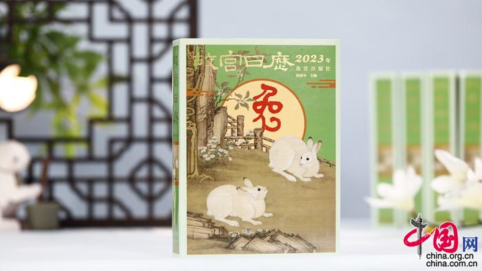 2023年《故宮日歷》封面源于故宮博物院的繪畫藏品——清代宮廷畫家冷枚的《梧桐雙兔圖》軸。雙兔在梧桐樹下回首對望,氛圍靜謐祥和。一輪滿月中的“兔”字系故宮博物院藏石鼓文字體,古樸大氣之中別具靈動。另外,12個月的篇章頁顏色也來自文物的色彩元素,每個月開啟一種新的色彩,賦予滿滿的儀式感。