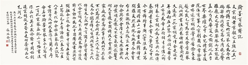 張瑞齡曾先后創作出版了《唐詩宋詞元曲各三百首小楷墨跡》《三字經百家姓千字文楷書字帖》《華夏正氣歌》《論語》等幾十萬字的楷書專著,廣受贊譽。本次展覽還首次展出了他創作的巨幅小楷長卷《古文觀止》。步入花甲之年他仍筆耕不輟,對書法的研究與傳承矢志不渝,始終自稱為“書法愛好者”。耄耋之年,他重開“十年寒窗”,專注于《岳陽樓記》《將進酒》《弟子規》等經典創作書法佳作。中國書法家協會理事、書法評論家張瑞田表示,先生在抄錄唐詩宋詞元曲時是飽含著深情的,筆道之間是有神采的,這恰恰是文墨兼優的重要體現。