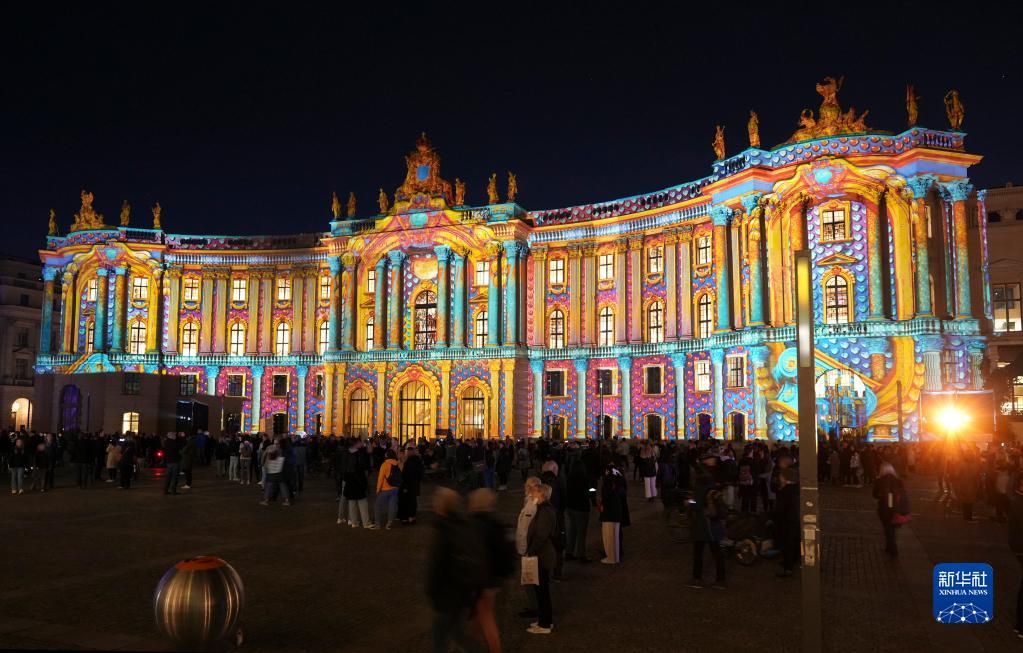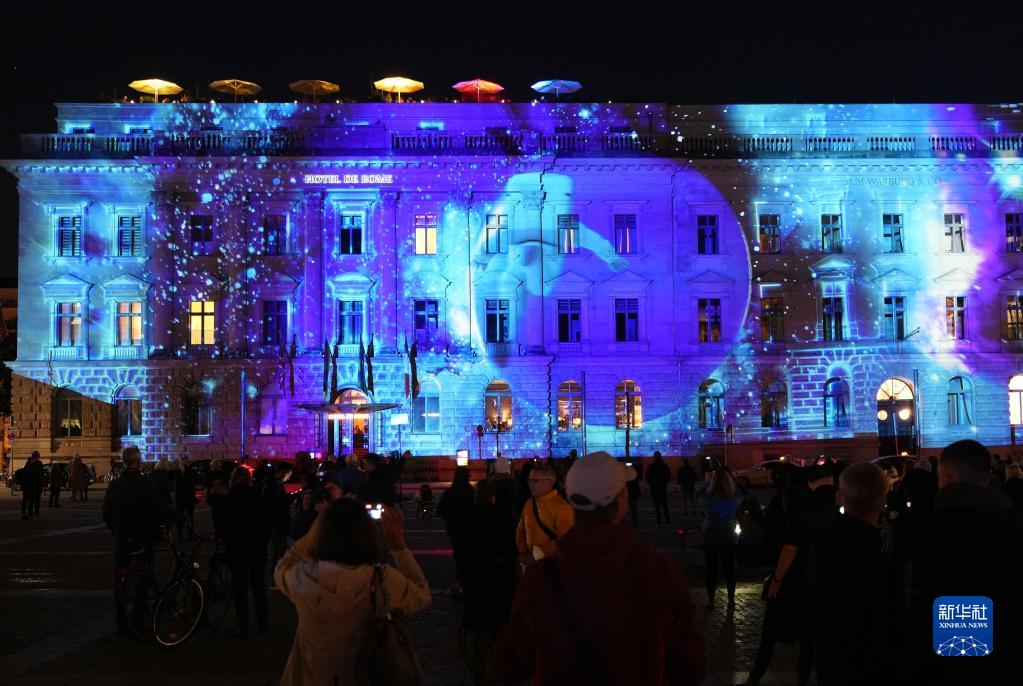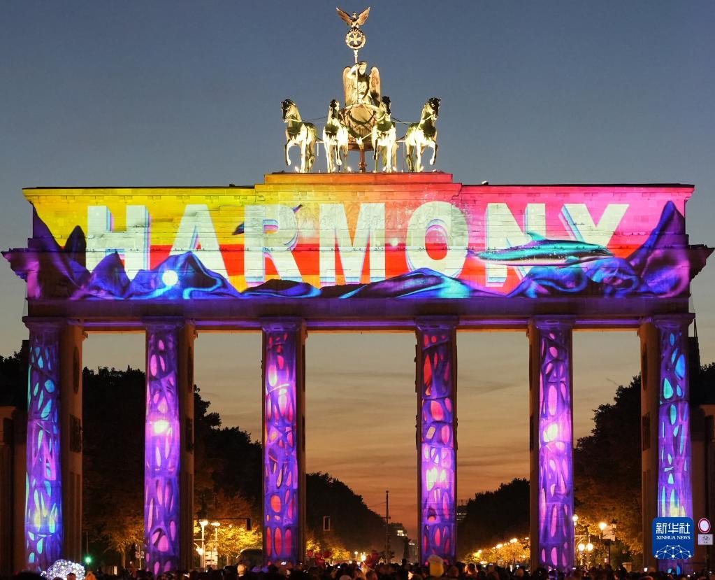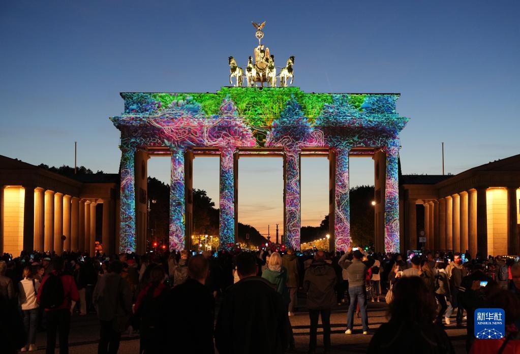 10月7日,德國柏林勃蘭登堡門被燈光點亮。柏林燈光節于10月7日至16日舉行。燈光節期間,柏林市內多個地標和建筑物將被燈光和裝置藝術品裝飾。新華社發(斯特凡·蔡茨 攝)