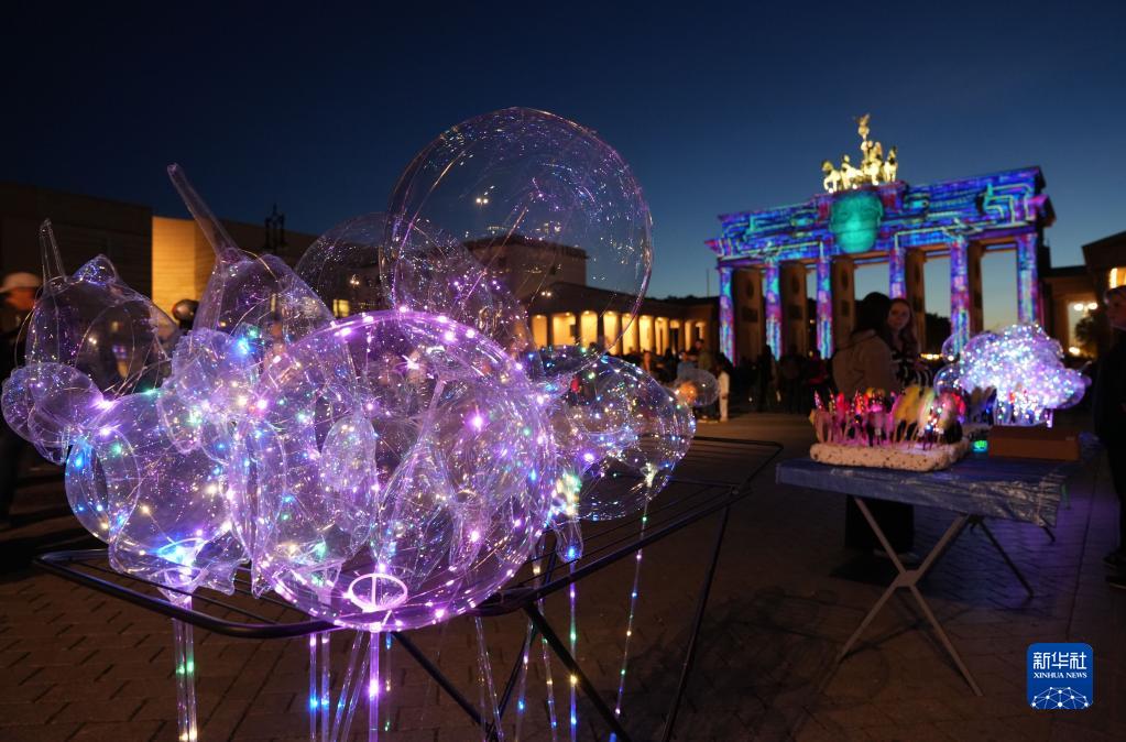 這是10月7日在德國柏林勃蘭登堡門前拍攝的用彩燈裝飾的氣球。新華社發(斯特凡·蔡茨 攝)