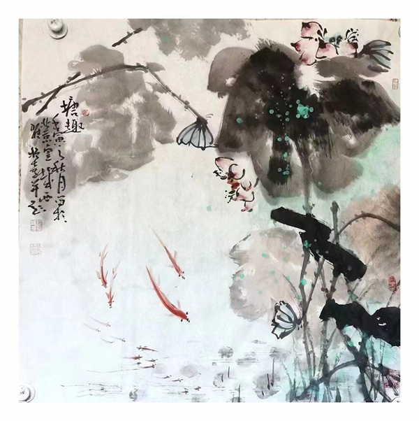 他把“弦”上藝術音樂旋律的動感注入進他的筆墨藝術中,這種藝術的嫁接,不是有意而為之的,而是無意識的,是自然而然的。由此,都會使他的美術作品產生了強烈旋律動感的美。他的寫意人物,他的寫意山水,尤其是他的寫意花鳥,色與墨的呼應,線與墨的勾連,墨與墨的和而不同,將這一個一個不同的藝術單元的元素組合起來,就是一首抒情的筆墨音樂,無不使人在畫面整體的審視中,將律動音樂的美盡情地享受。