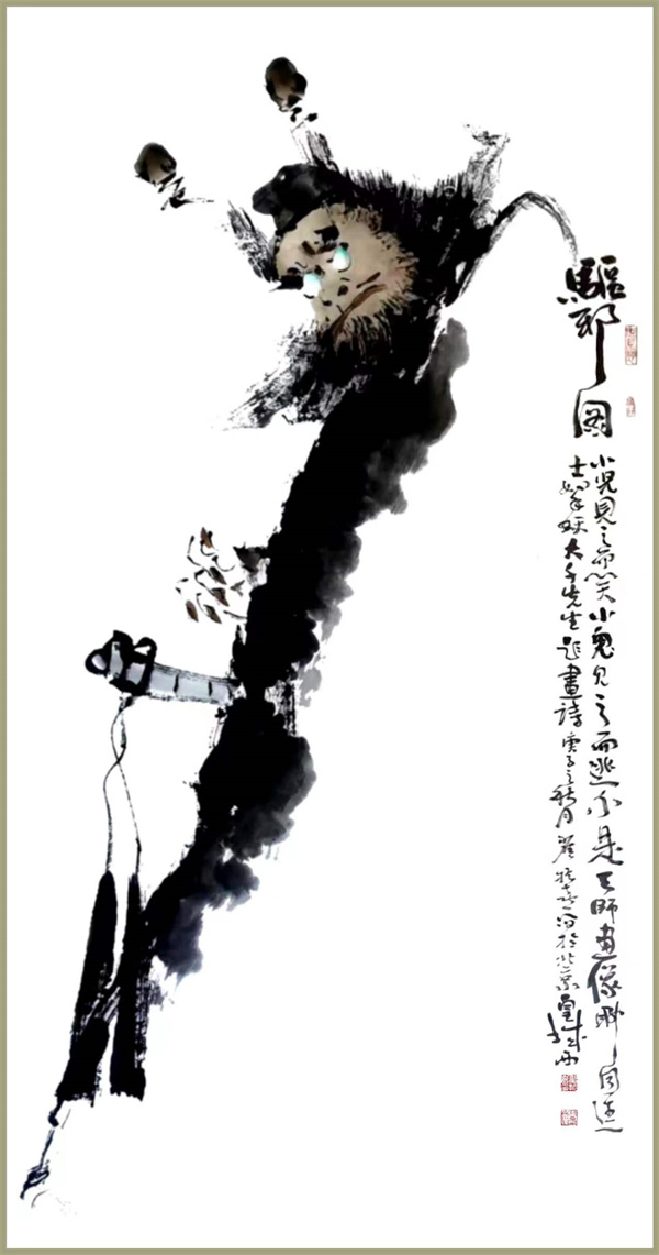 以超大寫意在宣紙上表現出靜合狀態流動著詩意的筆墨來,有幾何人?蘇東坡在《東坡題跋·書摩詰藍田煙雨圖》中是這樣贊王維的:味摩詰之詩,詩中有畫;觀摩詰之畫,畫中有詩。把這兩句話借用過來說翟氏筆墨,也是恰如其分了。著名山水畫家、中國美協黨組書記雷正民老先生曾這樣評價翟振喜的美術、書法作品,“他會營造出詩意的境界”。這就是翟振喜的本事!不僅他所創立的“鐘馗系列”超大寫意中強烈的流動著詩意的激情,他的說不上是大寫意還是小寫意筆墨下的花鳥、山水的構圖立意,落款題字等也無不流動著詩意的激情。他的落款題字多變如行云流水的線條,點綴著構圖中的重彩、水墨,使人張口就想誦一闕西江月或一闕望海潮。
