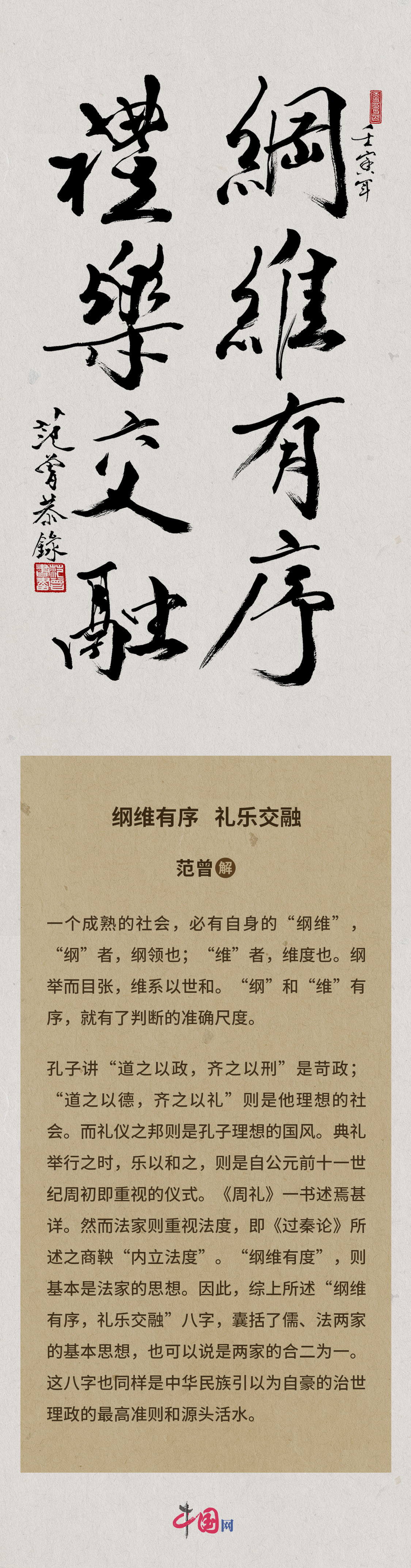 孔子講“道之以政,齊之以刑”是苛政;“道之以德,齊之以禮”則是他理想的社會。而禮儀之邦則是孔子理想的國風。典禮舉行之時,樂以和之,則是自公元前十一世紀周初即重視的儀式?!吨芏Y》一書述焉甚詳。然而法家則重視法度,即《過秦論》所述之商鞅“內立法度”?!熬V維有度”,則基本是法家的思想。因此,綜上所述“綱維有序,禮樂交融”八字,囊括了儒、法兩家的基本思想,也可以說是兩家的合二為一。這八字也同樣是中華民族引以為自豪的治世理政的最高準則和源頭活水。