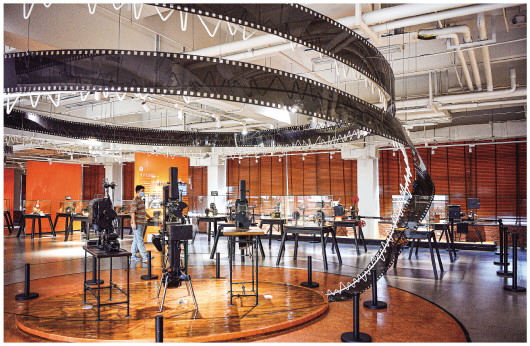 如今,人們路過西影,看到的是一個沒有圍墻的電影主題街區。磚紅色的蘇式辦公樓、攝影棚、洗印車間、置景車間留存著歷史的記憶,電影博物館里放映機、老膠片、老爺車、電影特效展示著電影產業的前世今生,國內最完整的一條膠片洗印修復及數字化生產線仍在修復老電影和視頻檔案,市民游客在文藝氣息濃郁的咖啡館和電影主題餐廳里休閑娛樂……