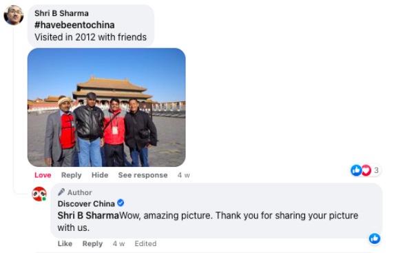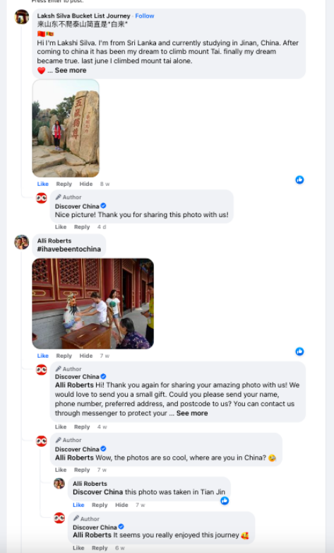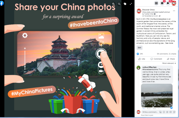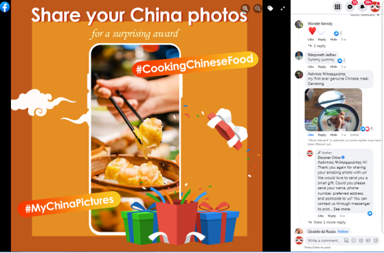 近期,中國網在Facebook、Instagram、TikTok、YouTube等海外社交平臺上發起了“中國,愛你的理由”線上主題圖片征集活動?;顒酉蚝M饩W友發出邀約,從衣、食、住、行等方面分享與中國相關的圖片記憶。此次活動歷時兩個月,通過中國網探索中國(Discover China)、探索北京(Discover Beijing)、這里是湖南(This is Hunan)等多個賬號發布了13期主題圖片。截至12月底,活動在海外社交媒體觸及人數超過302萬,吸引了37萬網友參與互動。各國網友通過文字和圖片評論,分享了自己與中國的故事。