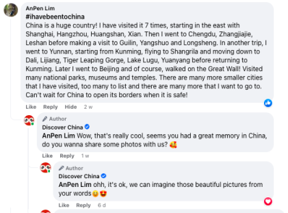 熱愛來中國旅游的朋友Anpen Lim評論道:中國真是個地大物博的國家。我去過7次,從東部開始,上海、杭州、黃山到西安。之后我還去了四川成都、樂山、湖南張家界,最后去了廣西桂林、陽朔和龍勝。還有一次去云南,從昆明出發,飛到香格里拉,下到大理、麗江、虎跳峽、瀘沽湖、元陽,然后返回昆明。后來我又去了北京,當然要去爬長城了!我在中國參觀了許多國家公園、博物館和寺廟。我去過的小城市還有很多,不勝枚舉,不過我還想去很多中國的其他城市,希望疫情結束再來中國。