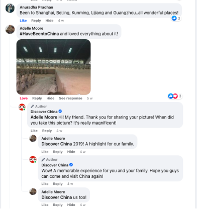 印度粉絲Anuradha Pradhan評論:我去過上海、北京、昆明、麗江和廣州……這些美不勝收的地方!新西蘭粉絲Adele Moore在留言區附上了秦始皇兵馬俑的照片,評論道:我和家人在2019年去過中國,對于我們家來說是一段精彩的經歷,我愛中國的一切。