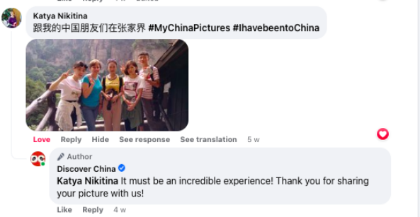 俄羅斯粉絲Katya Nikitina用中文留言道:跟我的中國朋友們在張家界。