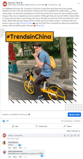 還有英國粉絲William投稿評論:我在中國生活了很長時間,在這里有很多很棒的經歷。我最愛中國的共享單車,它們便捷又便宜,生活里真的少不了它們。