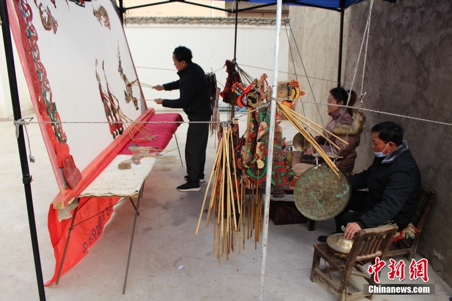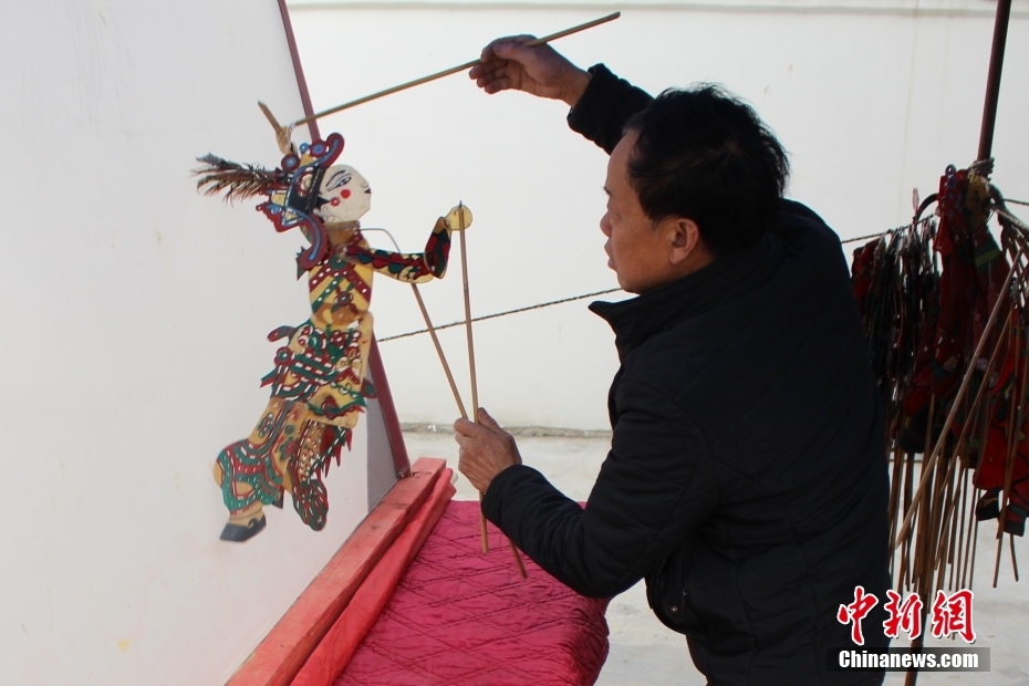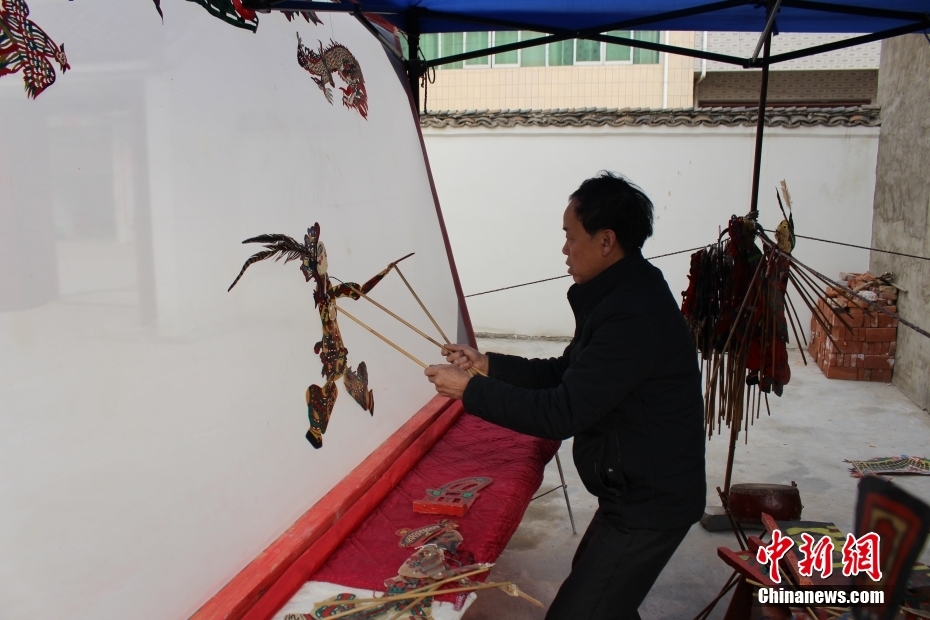 資料圖為2022年12月15日,河南信陽,方德春在鄉村表演皮影戲,傳承非遺文化。中新社發 楊潔 攝