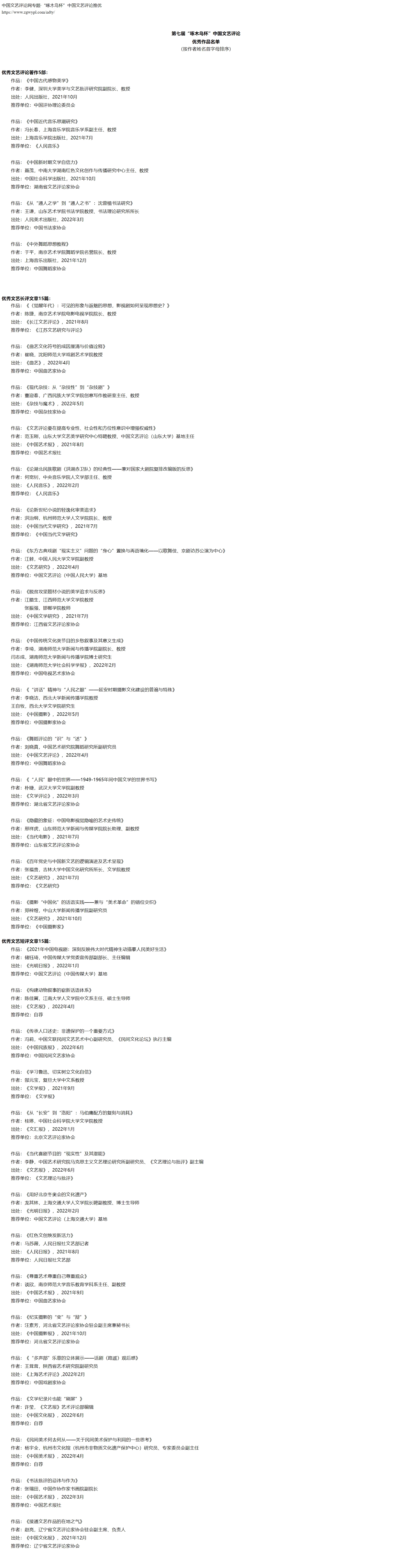 據悉,本屆推優活動作品經過推薦單位按名額推薦和中評協會員自薦,共收到作品705份,其中著作76部、長評442篇、短評187篇。推優秉承堅持導向、注重質量、寧缺毋濫的原則,經過初評、復評、終評,并報中國文聯批準,最終推選出優秀文藝評論著作5部、優秀文藝長評文章15篇、優秀文藝短評文章15篇。