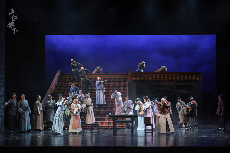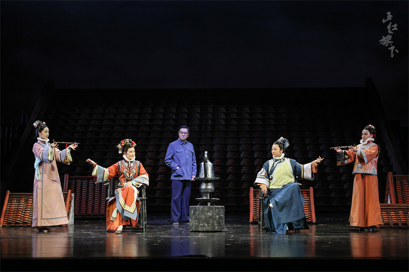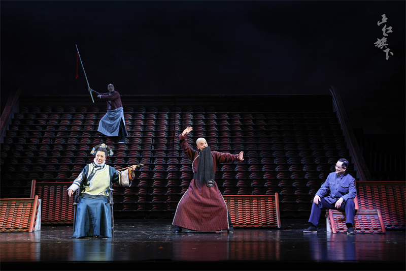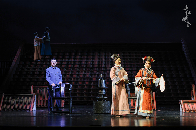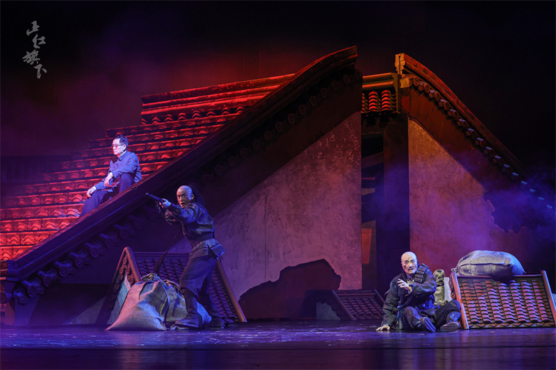 該劇的整個舞臺表達都區別于以往傳統的京味兒戲。眾多的場景中,不見熟悉的市井小院,京城宅門兒,而是代之以紅色的屋頂,整齊的琉璃瓦。以象征的元素,寫意地表現出北京的特點,既有代表性又有視覺上的沖擊。以屋頂為視覺中心的舞臺上,演員穿梭自如,完成一次次時間與空間的分割與串聯,既寫實又寫意。導演與舞美設計常疆一起強調了“既是北京的又是現代的”這一理念?!拔沂窃谟幸淮误w驗生活的時候在鐘鼓樓上俯瞰北京得到的靈感,用北京獨有的房頂來代表這里,紅色是紅墻的顏色,黃色是琉璃瓦的顏色,這兩個傳統顏色也代表了北京?!瘪T遠征表示。除了舞臺設計,在舞臺表現形式上也大膽借鑒中國傳統戲曲的樣式,結合舞蹈的形式,展現出八旗的場面,讓觀眾在宏大的氣勢中,想象出當時的生活。