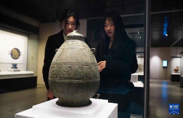 2月9日,在孔子博物館舉行的山東文物精品展上,參觀者在觀看孔子博物館收藏的西周青銅器侯母壺。