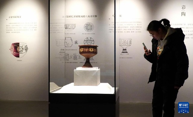 2月9日,在孔子博物館舉行的山東文物精品展上,參觀者在觀看山東省文物考古研究院收藏的大汶口文化八角星紋彩陶豆。