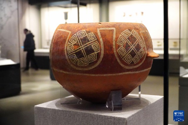 2月9日,在孔子博物館舉行的山東文物精品展上拍攝的山東省文物考古研究院收藏的大汶口文化花瓣紋彩陶壺。