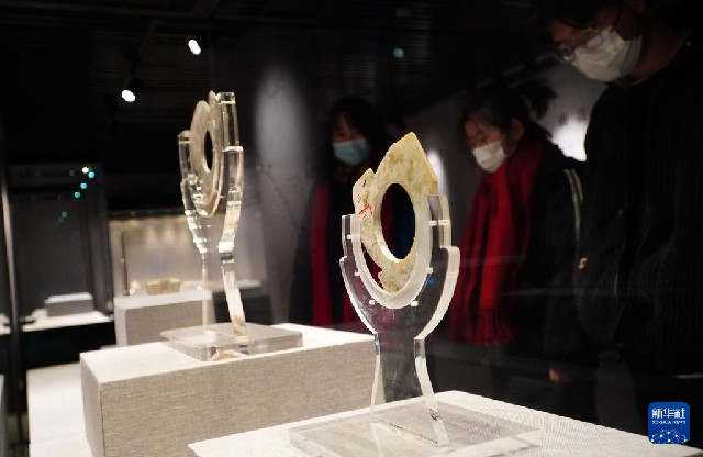 2月9日,在孔子博物館舉行的山東文物精品展上,參觀者在觀看五蓮縣博物館收藏的龍山文化玉璇璣。