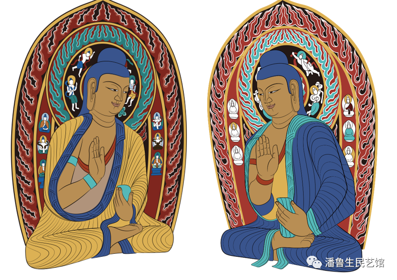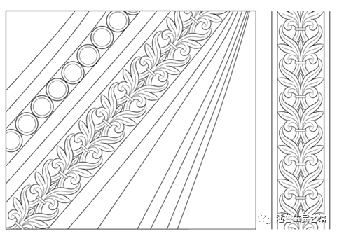 云岡紋飾附著于主尊造像、龕體、塔柱、壁面,鐫刻手法有剔地起突、減地平钑、壓地隱起、素平陰刻等類型。其演變總是遵循一定的骨骼線展開,比如“一”字形帶狀骨骼、“S”形骨骼、“十”字形對稱骨骼等,結合不同的表現主題,形成了團狀、波狀、嵌套等多種紋飾形態。單獨紋樣的有序排列,又形成了二方連續、四方連續的構成樣式。云岡紋飾構成與敦煌莫高窟相比,既有統一性,又有獨特性,在二者的比對中可以補充紋飾色彩的不足。如三角形角隅忍冬紋,在云岡的屋脊上出現,而敦煌莫高窟的藻井上具有很多同類紋飾是作為角隅紋樣使用,其色彩搭配的方法也比較多變。云岡石窟的同一個石窟中,往往紋飾類型、題材和風格都比較接近,或許是雕刻匠人的同期性,造成同一個窟的紋飾造型和雕刻風格的相對一致性,由此即便有殘缺的壁面,也能夠推斷出相應的題材類型和雕刻方法。如第16窟南壁窟門與明窗西側盝形龕的雕刻形制與東側基本相同,但在細節上有細微差別,由于南壁窟門與明窗東側沒雕完,且破損嚴重,通過參考比對,可以辨析出二者的異同,未雕刻完成的部分只雕刻了圓形頭光與飄帶輪廓,可見云岡紋飾雕刻的流程痕跡。此外,紋飾系統的分類和分期研究驗證了紋飾圖像風格演變的軌跡,從中可以明顯感受到民族文化交流和交融的脈絡。