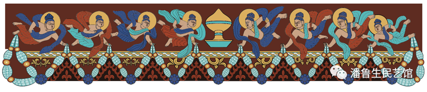單體紋樣、連續紋樣、復合紋樣等各式組合樣式在這一時期顯得更為豐富。源自波斯的忍冬紋,在第5、6、9、10、11、12、13窟中增加了三角忍冬、環狀忍冬、纏枝忍冬、環狀套圭忍冬、龜甲忍冬等豐富樣式,這個時期云岡忍冬紋飾的類型非常多樣,造型亦簡亦繁,內容豐富靈活,形象生動活潑。各窟窟頂平棋藻井團蓮飛天組合靈活多變,壁面、平棋藻井、龕格、角隅位置的飛天形象格外豐富,造型靈活多變。瓔珞、華繩、束帛裝飾是由犍陀羅傳入的希臘紋樣,這些紋樣與傳統中國建筑構件的拼合雕刻也能夠看出裝飾風格的演變。