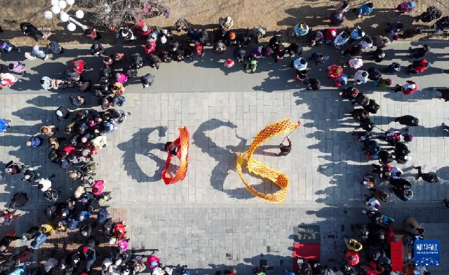 2月21日,在天津市水上公園,民間藝人表演空竹舞龍(無人機照片)。