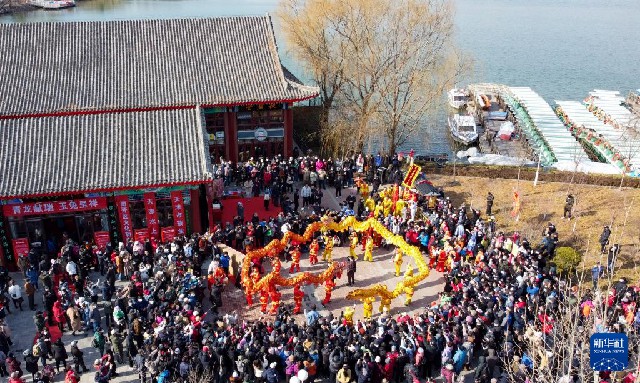 2月21日,在天津市水上公園,市民群眾觀看舞龍表演(無人機照片)。