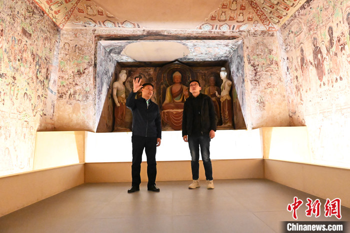 圖為2月17日,甘肅省蘭州市,汪萬福在敦煌藝術館復制窟內向中新社記者介紹莫高窟預防性保護監測預警體系。中新社記者李亞龍攝