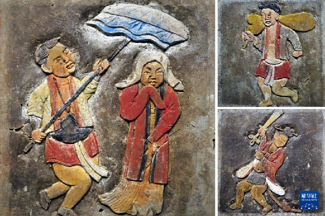 這是在鄭州大象陶瓷博物館舉行的“宋人生活與二十四孝磚雕展”上展出的社火彩繪磚雕(3月1日攝,拼版照片)。