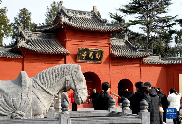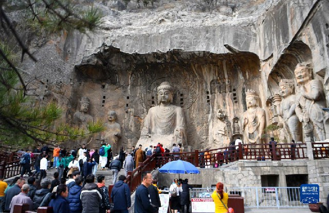 3月1日,游客在洛陽市龍門石窟景區內游玩。