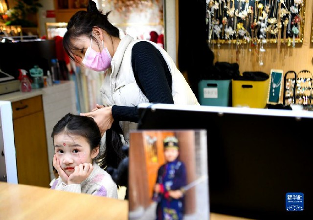 在洛陽市洛邑古城一家傳統服飾店內,工作人員給小游客梳妝(2月28日攝)。
