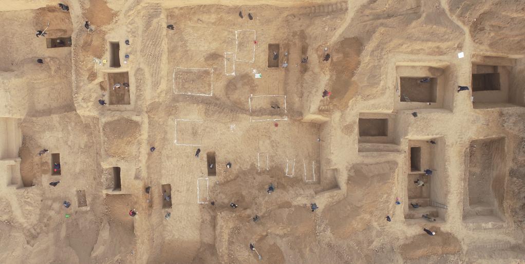 圖為河南三門峽陜州城墓地遺址發掘現場航拍圖。(三門峽市文物考古研究所供圖)