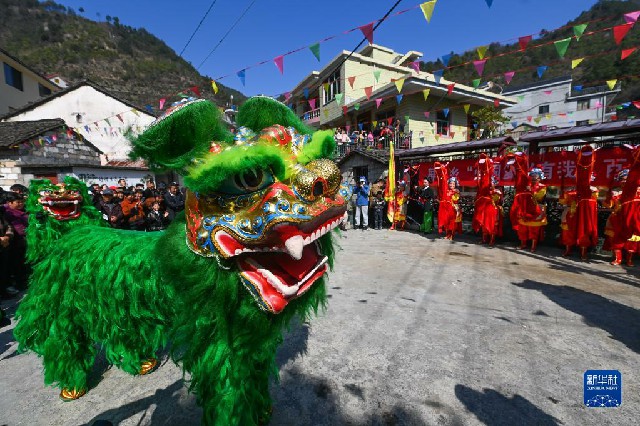 這是3月10日在浙江省杭州市淳安縣屏門鄉屏前村傳統廟會上拍攝的“齊坑綠獅”表演。
