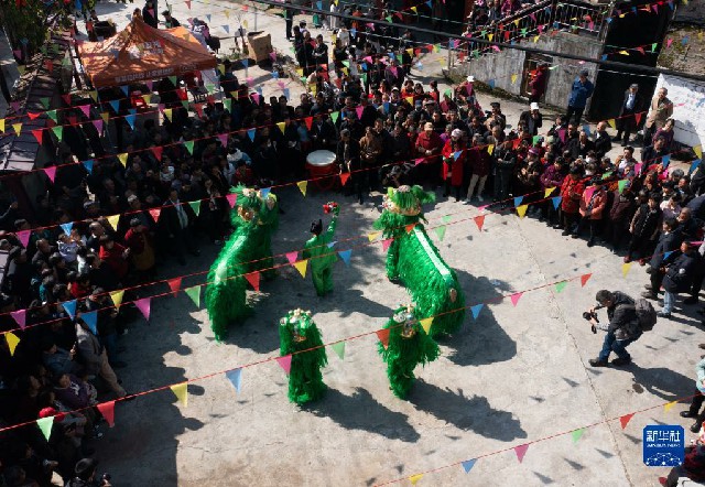 3月10日,在浙江省杭州市淳安縣屏門鄉屏前村的傳統廟會上,人們在觀看“齊坑綠獅”表演(無人機照片)。