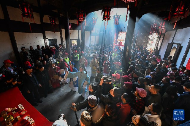 3月10日,在浙江省杭州市淳安縣屏門鄉屏前村的老祠堂內,人們在觀看表演。