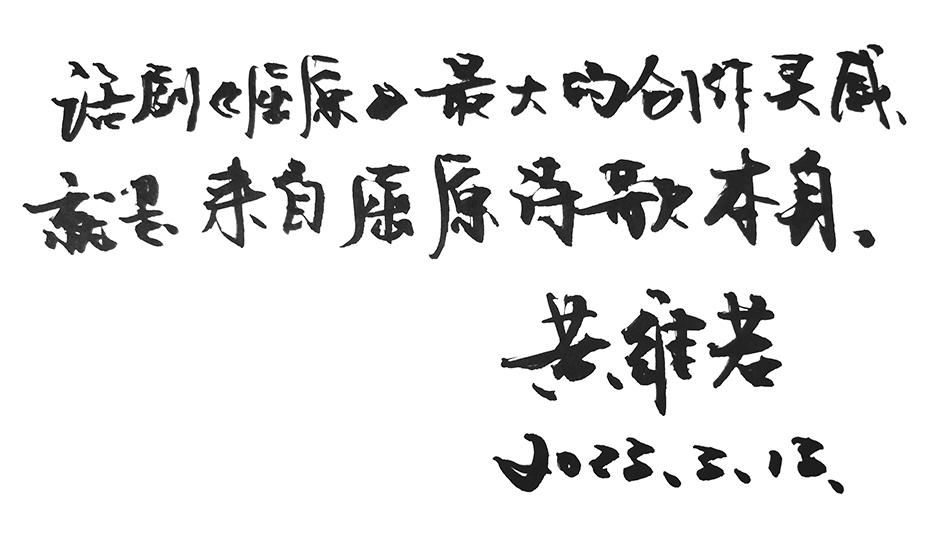 3月13日,媒體見面會之后,就新編歷史話劇《屈原》創作內外的一些問題,黃維若教授接受了記者的專訪,并為本報題詞:“話劇《屈原》最大的創作靈感,就是來自屈原詩歌本身?!?/p>