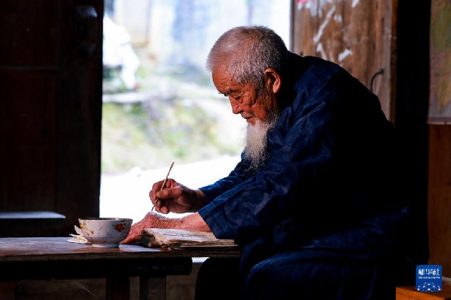 3月10日,水書先生潘秀業在家中書寫水書文字。