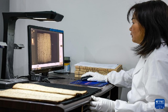 3月8日,荔波縣檔案史志館的工作人員在用掃描儀錄入水書文獻。
