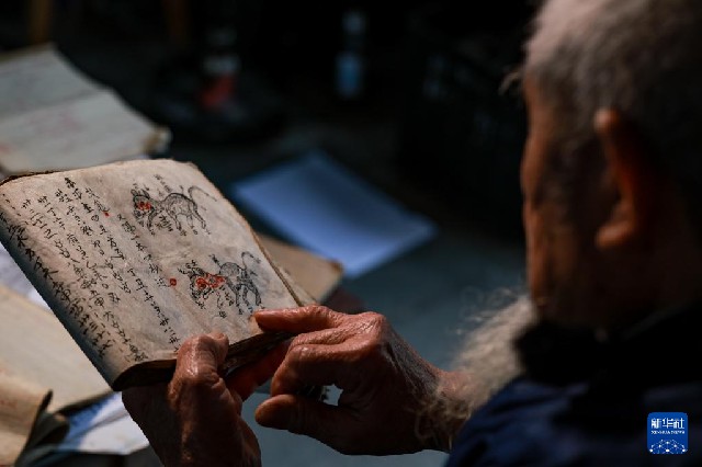 3月8日,水書先生姚覃軍在閱讀水書文獻。