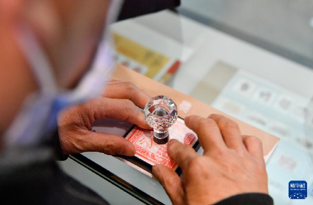 3月23日,在天津郵政博物館,工作人員為集郵愛好者購買的紀念封印郵資。