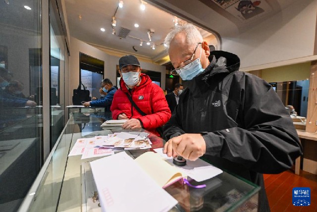 3月23日,在天津郵政博物館,集郵愛好者在紀念封上加蓋紀念戳。