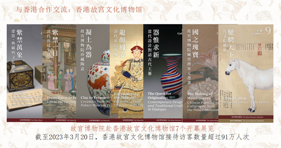 據介紹,1999年澳門回歸祖國至今,故宮博物院已赴澳門成功舉辦專題文物展31項,成為澳門民眾心中的固定文化盛宴。2019年,故宮博物院與澳門特區政府社會文化司合作設立“澳門故宮文化遺產保護傳承中心”,共同探索創新合作模式,推動澳門文化事業的發展。2022年,香港故宮文化博物館正式對公眾開放,故宮博物院赴香港故宮文化博物館舉辦7個開幕展覽,把故宮承載的中華優秀傳統文化落地到香港,增強香港市民及青少年的國家和民族認同感。截至2023年3月20日,香港故宮文化博物館接待訪客數量超過91萬人次。