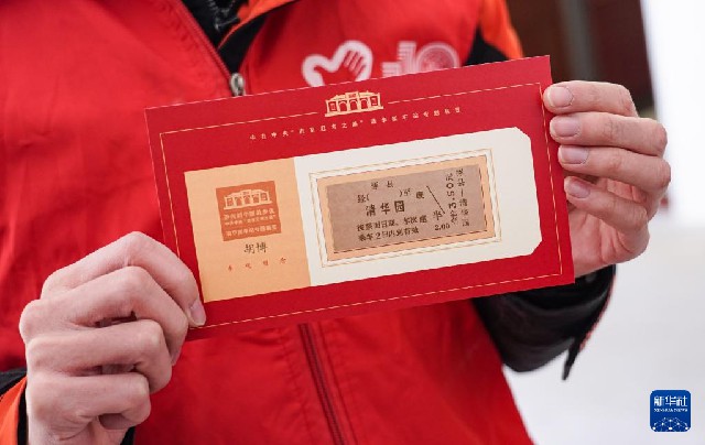 3月25日,在清華園車站舊址的專題展覽廳內,一名志愿者展示印有“老車票”的紀念卡片。