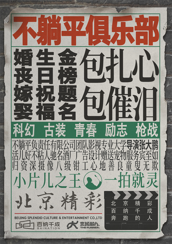 “不躺平負責任有限公司團隊影視專業大學導演張大鵬,活兒好不粘人”、承接“婚喪嫁娶、生日祝福、金榜題名”各類小片兒制作、“包扎心、包催淚”、“小片兒之王,一拍就靈”……廣告上的文案土酷喜感拉滿,字里行間也彰顯著“張大鵬導演”的不凡實力和絕對誠意。