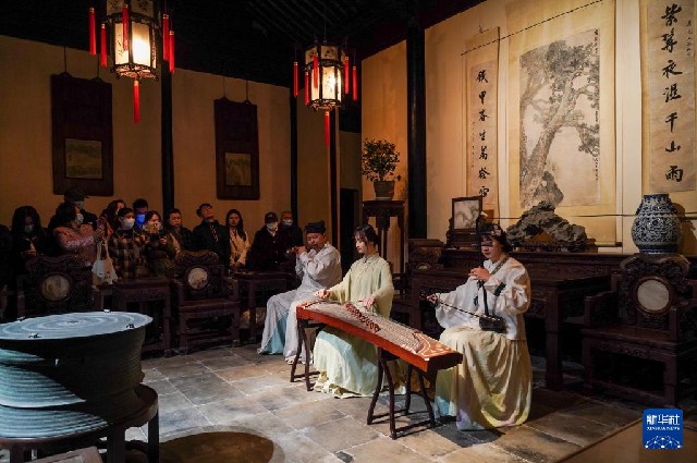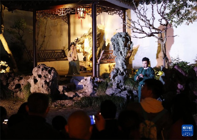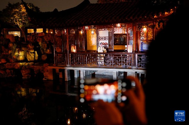 近年來,江蘇省蘇州市網師園通過數字化展示手段,結合江南絲竹演奏、昆曲、評彈等傳統曲藝表演,不斷探索園林夜游發展新模式,將古典美學融入現代生活,為游客展示夜間的園林魅力。