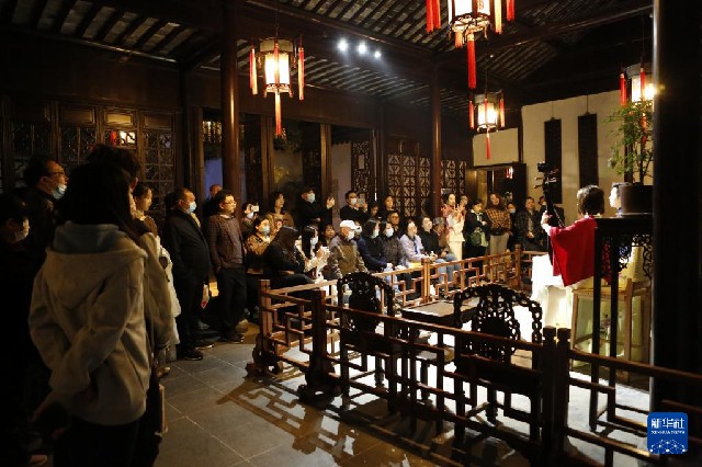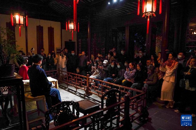 4月5日,觀眾在蘇州網師園內觀看評彈表演。