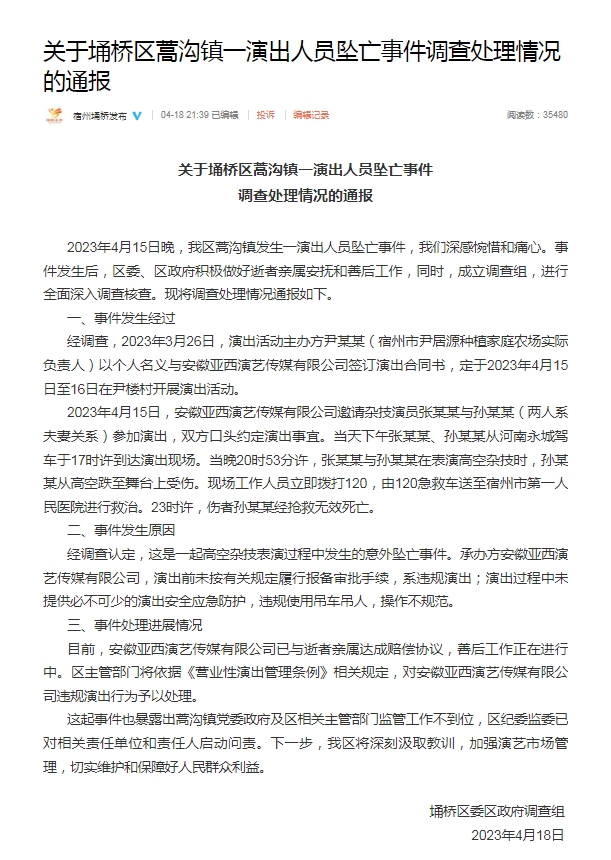 中新網4月18日電 據安徽省宿州市埇橋區人民政府辦公室官方微博消息,埇橋區委區政府調查組18日發布關于關于埇橋區蒿溝鎮一演出人員墜亡事件調查處理情況的通報。2023年4月15日晚,埇橋區蒿溝鎮發生一演出人員墜亡事件?,F將調查處理情況通報如下。