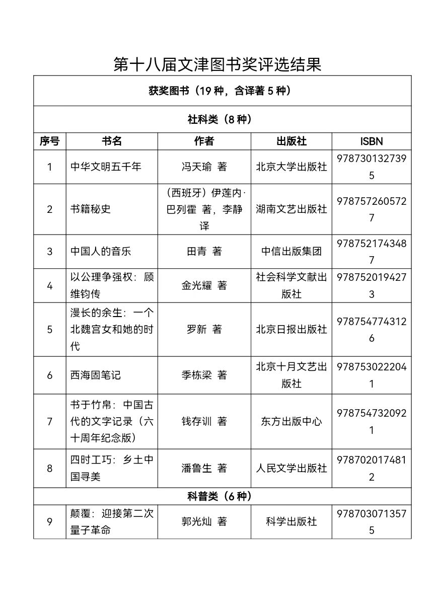 附:第十八屆文津圖書獎評選結果
