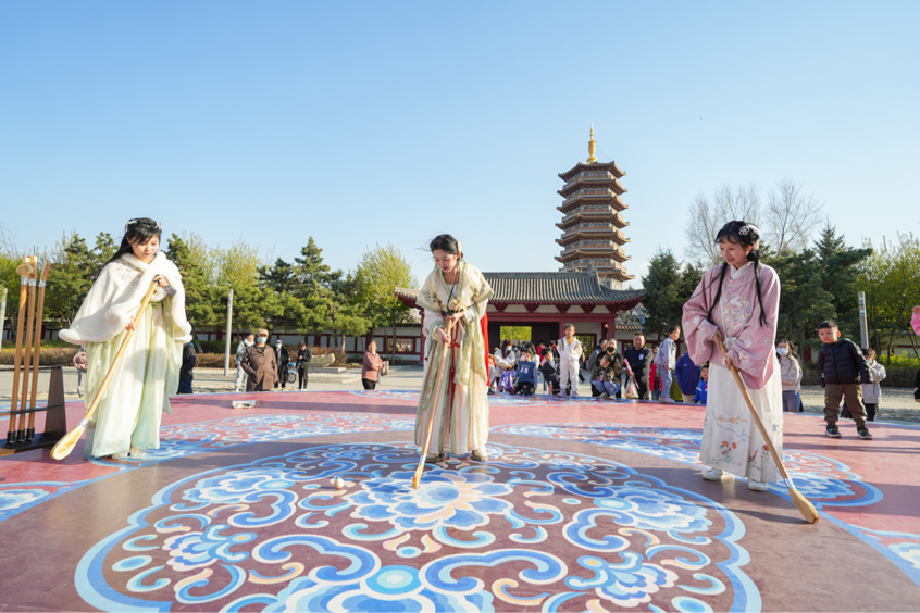 投壺是我們最熟悉的項目了;蹴鞠也許我們大家都聽過,但沒有嘗試過,蹴鞠起源于戰國時期,是中國最早的足球運動的前身。捶丸可能對現代人來說把他稱為“中國古典高爾夫”更容易理解,在古代也是很盛行的運動哦;木射也許把它稱作“中國古典保齡球”會讓大家了解到它的玩法,這個游戲里面也是蘊涵了很多傳統文化在里面。這四項古代運動吸引了很多漢服同袍和游人參與,玩得很開心。