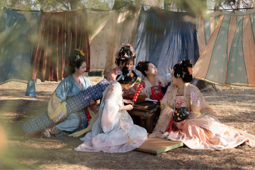 “裙幄宴”是唐代開元年間至天寶年間京城仕女們經常舉辦的一種野外聚餐活動。春天里,百花爭艷,女子們相約作伴,攜帳幕、餐具、酒器及食品等,到郊外休閑設宴。由于這種宴會是在裙帳中進行的,故也稱“裙幄宴”。