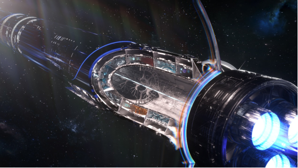 《引力之外》將3400平的場地打造為“萬有引力”號,還原了原著中的描述——圓柱體卷軸式的飛船,外表為黑色鏡面,為了“通過誠實地映射宇宙來隱藏自己”。由于艦體本身是一個引力波發射器,在空間設計時,艦船上的大部分空間都設定為貼著飛船內壁分布,引力波天線貫穿飛船的中心,位于其他空間的頭頂。